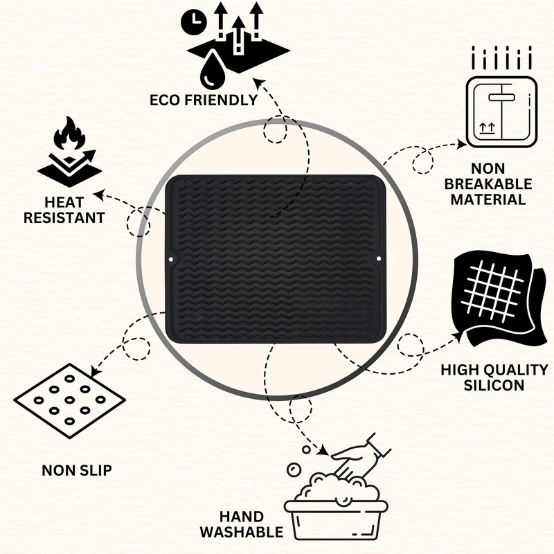 Silicone Dish Drying Mat for Multiple Usage,Easy clean,Eco-friendly,Heat-resistant Silicone Mat for Kitchen Counter or Sink,Refrigerator or Drawer liner (Black, 12inches x 16inches)