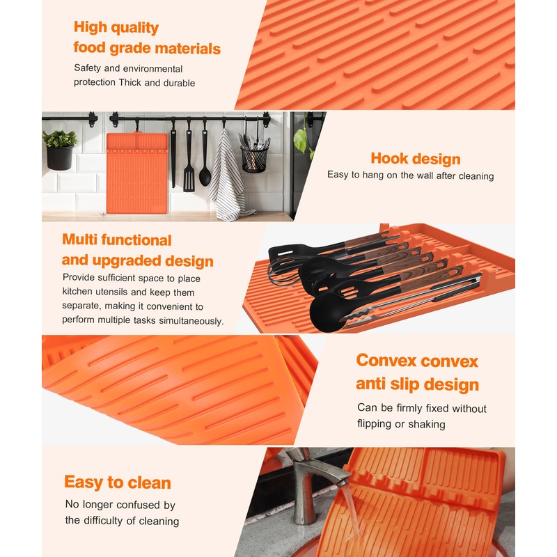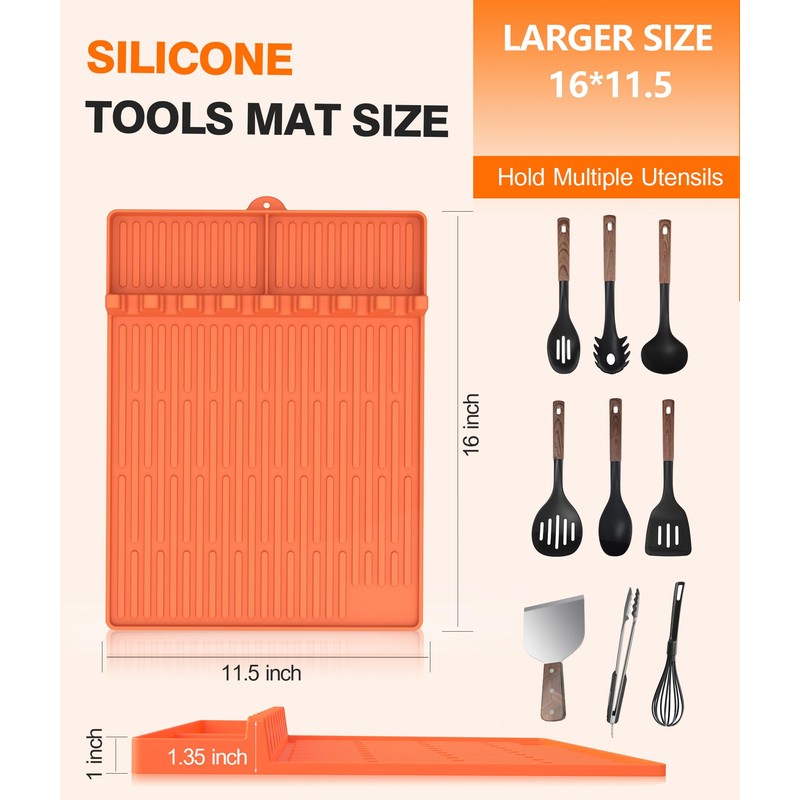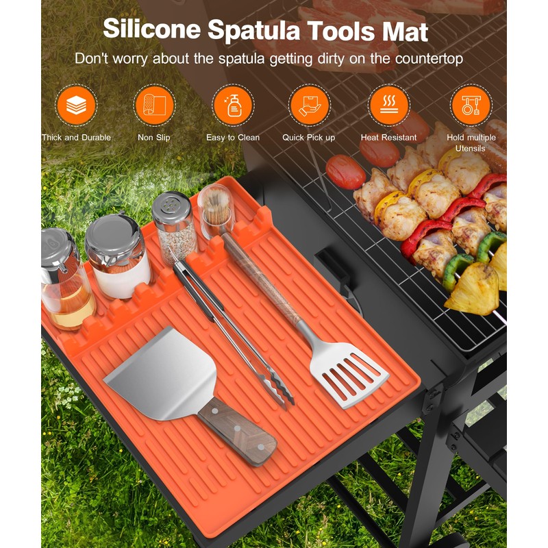 - Large Multipurpose Silicone Spatula Mat: With a large size of 16 inches by 11.5 inches with 8 slots, this silicone spatula tools mat will keep various grill cooking tools such as spoons organized and within easy reach on your grill side shelf when multi-tasking in the kitchen- keep your cooking area clean and tidy!
