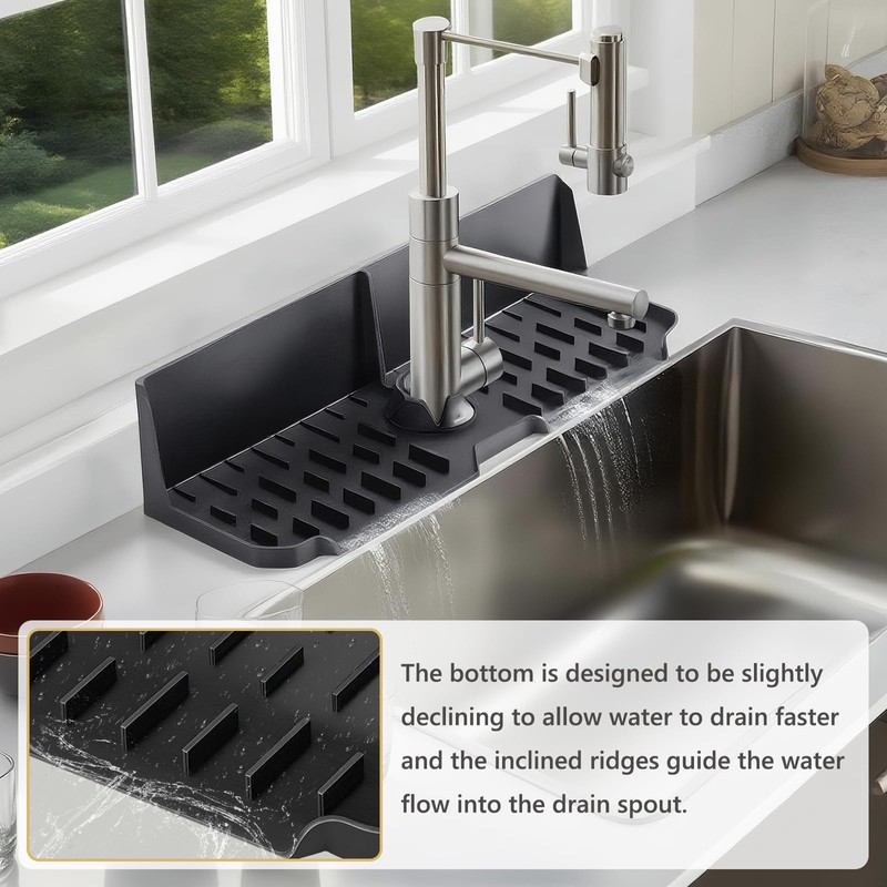 - FAST DRAINAGE, DRY COUNTERTOPS: Silicone sink faucet mat with upgraded 5° slope design and, the kitchen faucet splash guard allows captured water to flow into the sink faster, resulting in faster drying of the kitchen sink. For bathroom: put facial cleanser, toothbrush cup on it. Used as a small organizer mat, drain pad. It is a super practical kitchen & bathroom gadgets