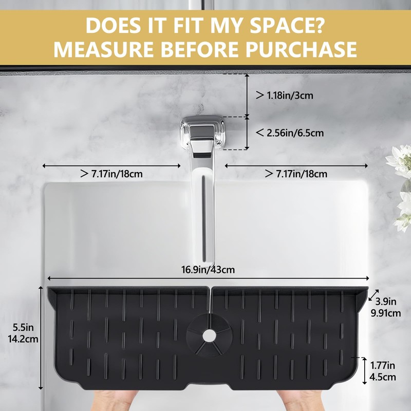 - PRACTICAL SINK ORGANIZER TRAY: Our kitchen sink faucet mat features a cuttable center hole for different faucet sizes and a 90° foldable edge that fits snugly behind your sink. It acts as a kitchen or bathroom sink backsplash guard, protecting walls from water and preventing messes around the faucet