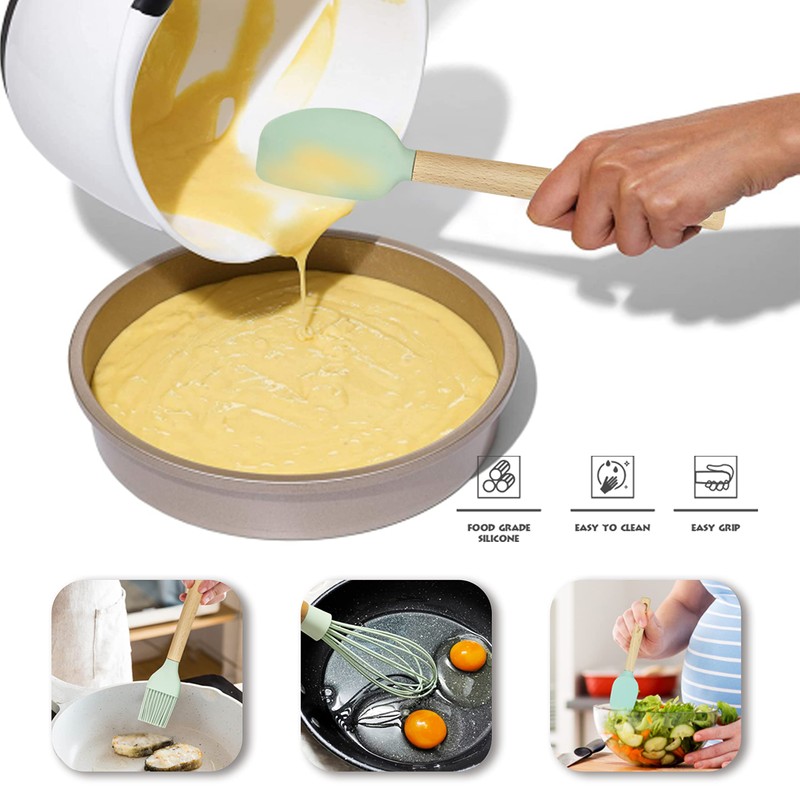 - ★ PERFECT FOR A GIFT – Designed in a mint green color and a natural wood tone, this set of mini silicon kitchen tools has an up to date, trendy look that is madly in line with the current styles and trends. Add a splash of color and funk to your kitchen and easily hang from the big hole on each utensil. Cook, bake, grill and serve with fun and fashion at the same time. Perfect for an impressive gift as well.