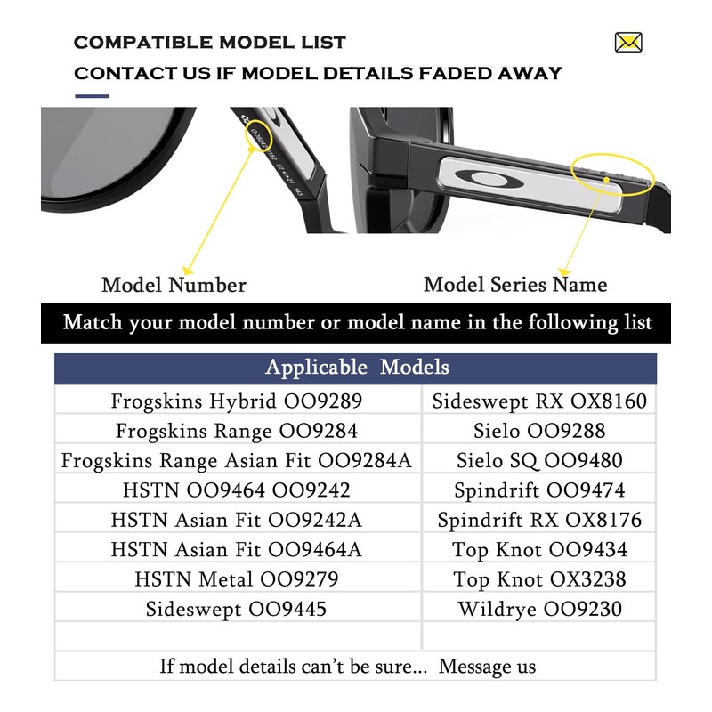 - Easy Installation - No tool needed, just match the model name or model number on the legs of your sunglasses with our compatible model list is enough.