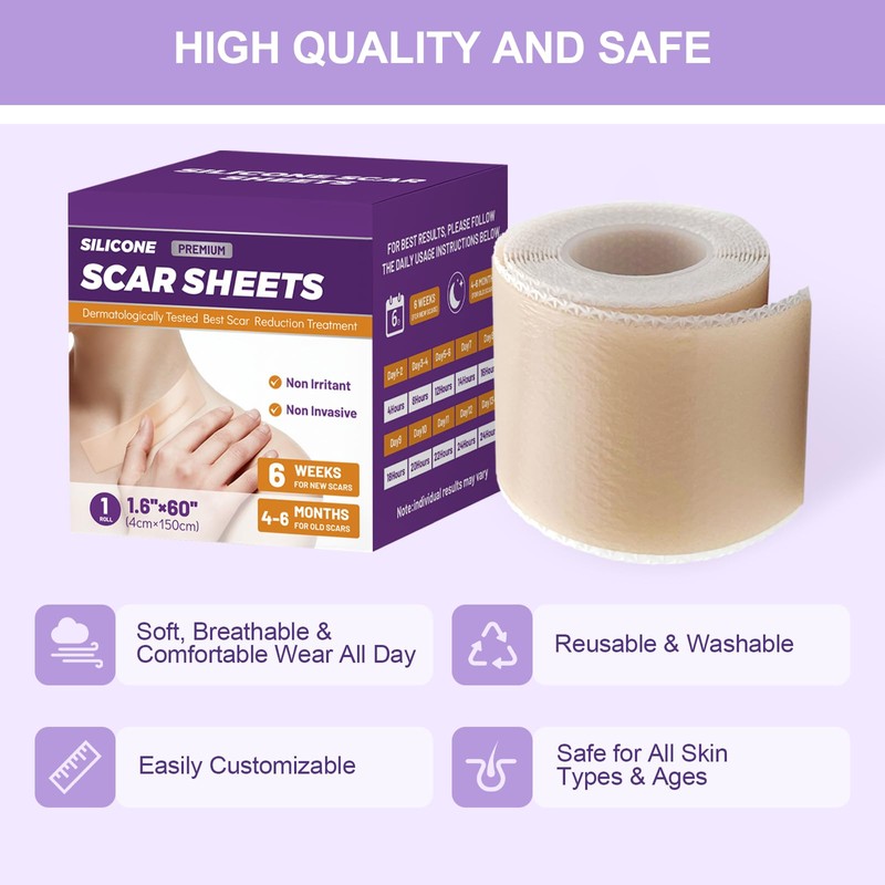 • [Precise Fit & Easy Customization]: Our silicone tape for scars is easy to trim to any scar’s shape or size. Whether it's for silicone scar sheets for surgical scars, facial marks, or long incisions, you get full control. Washable and reusable—just rinse and air dry.