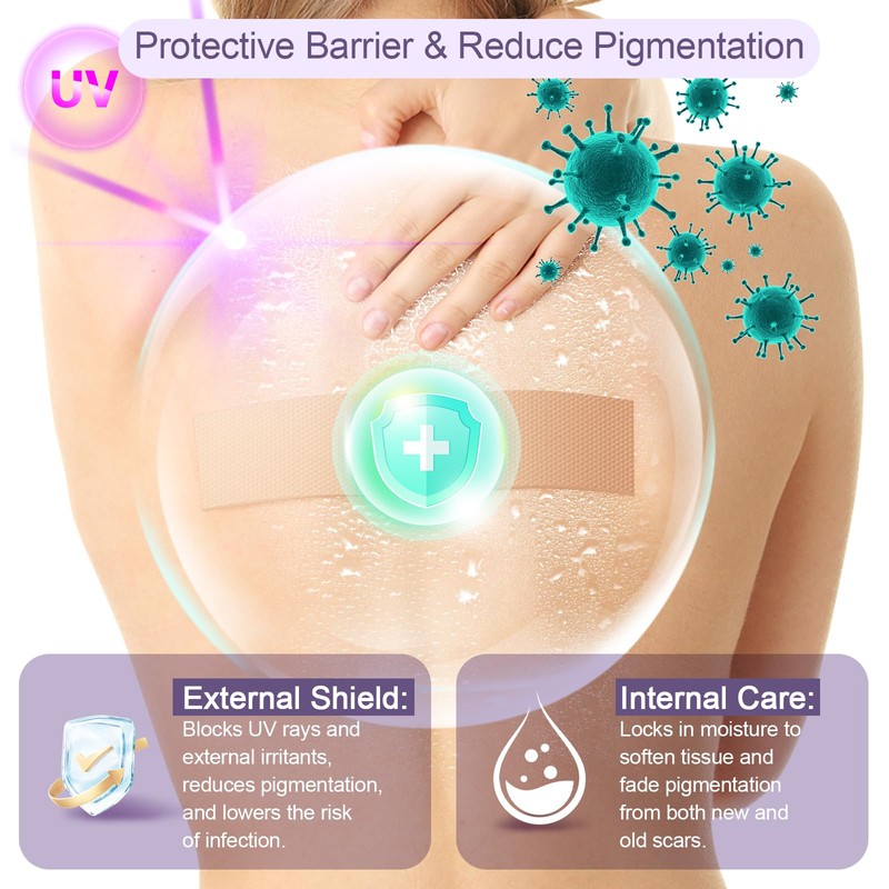 • [Protective Barrier & Reduce Pigmentation]: This scar tape forms a protective barrier that shields scars from UV rays and external irritants—helping reduce pigmentation and infection risks. Meanwhile, its inner moisture-locking function softens the skin and fades discoloration caused by both new and old scars.