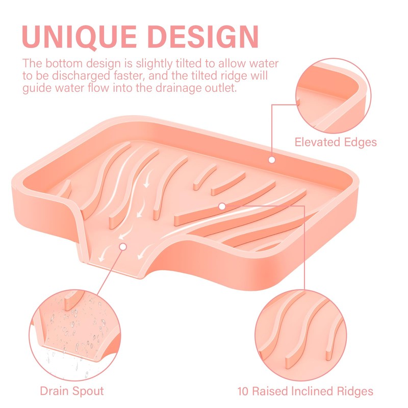 - Self Draining Soap Dish for Shower: Our soap dish for bathroom sink has a convenient drain spout that allows excess water to drain directly into the sink or shower, preventing soap or sponge from getting soaked and soap from going rancid, and helping to keep your sink or counter clean and dry.