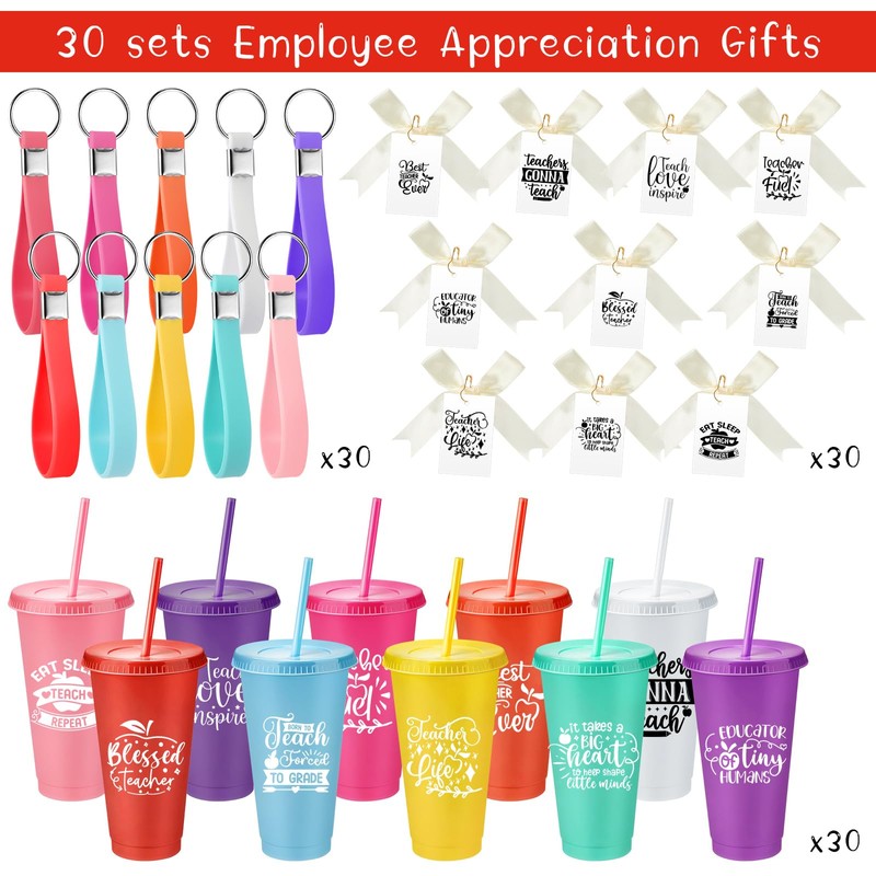 - Teachers Appreciation Gifts Bulk: you will receive 30 sets of teacher thank you gifts, including 30 teacher appreciation tumblers with straws and lids, 30 bows, 30 cards and 30 silicone keychains, sufficient quantity and rich combinations can easily meet your daily use and gift-giving needs