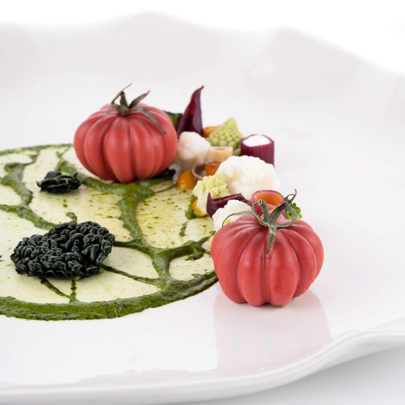 - 1 silicone sheet for molding 12 petite tomato shapes for beautifying dishes laid out on a plate
