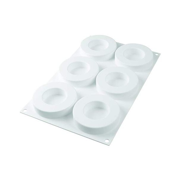 • 最初のシリコン型:リング-65の外側 - 6つの焼き付けまたは冷凍食品をリング形状に作り、各キャビティの容量は2.4オンス(65ミリリットル)、各キャビティの寸法 外径は3.35インチ、内径1.97インチ、高さ0.7インチ (外径85ミリメートル、内径50ミリメートル、高さ18ミリ)。
