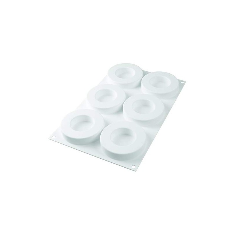 最初のシリコン型:リング-65の外側 - 6つの焼き付けまたは冷凍食品をリング形状に作り、各キャビティの容量は2.4オンス(65ミリリットル)、各キャビティの寸法 外径は3.35インチ、内径1.97インチ、高さ0.7インチ (外径85ミリメートル、内径50ミリメートル、高さ18ミリ)。