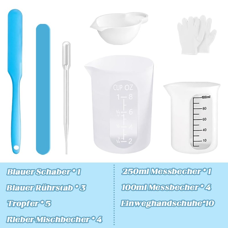 - [Umfassendes Set an Harzprojekten] Unser silikon messbecher Set enthält alles, was Sie für Ihre kreativen Harzprojekte benötigen: blauer Spatel*1, blauer Rührstab*3, 250-ml-Messbecher*1, 100-ml-Messbecher*4, Mischbecher*4, Tropfer*5, Einweghandschuhe* 10 Paare. Ideal zum Mischen, Formen und zur Schmuckherstellung – perfekt für Hobbykünstler und Profis gleichermaßen!