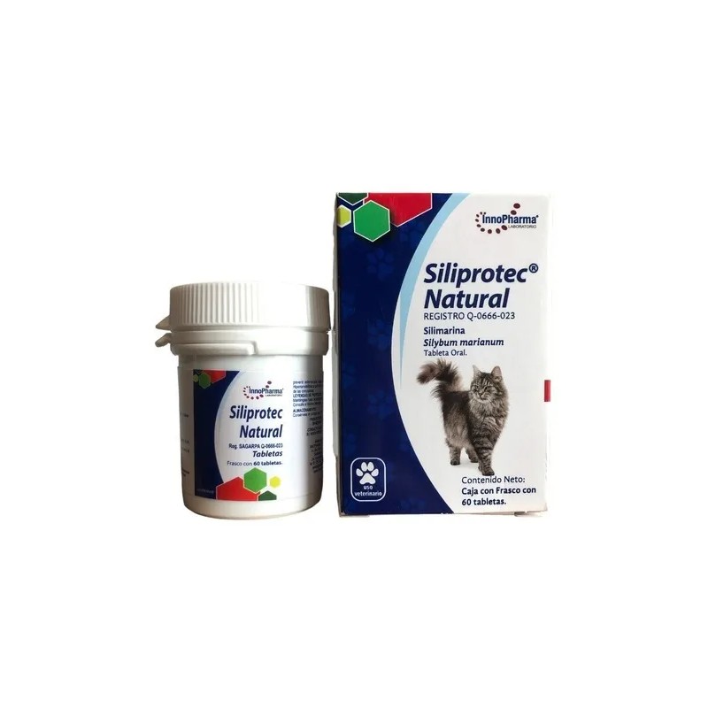 Siliprotect Natural Tabletas 100 MG para gatos y perros es un hepatoprotector y antioxidante que contiene silibina y isosilibina, derivados de la silimarina. Se utiliza para estimular el metabolismo hepático en mascotas, administrándose por vía oral según el peso y criterio veterinario. La dosis varía según el tamaño del animal, y se recomienda consultar al veterinario para determinar la duración del tratamiento.