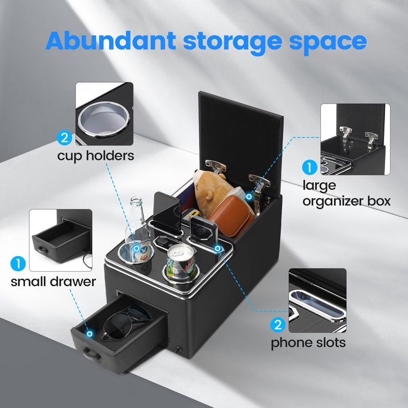 - Abundant storage space:Universal Center Console Organizer Equipped with a small drawer, two cup holders, two phone slots, and a large organizer box , allowing you to easily organize various items and keep the car tidy. our center console doubles as an armrest, seamlessly fitting between rear seats with just the right height to provide rear passengers with a supportive hand rest.