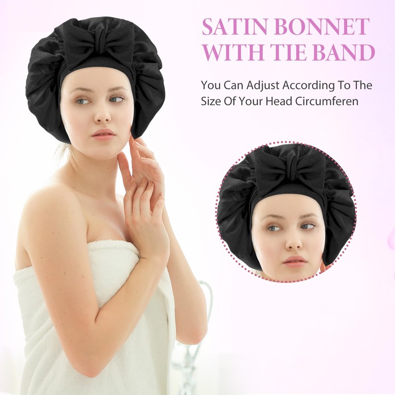 - [High-quality Satin] The large silk bonnet is made of satin with good texture, which is breathable and skin-friendly and keeps moisture in the hair. The long band is wide, soft and comfortable, the satin bonnet does not constrict and leaves no marks on your head for added comfort.
