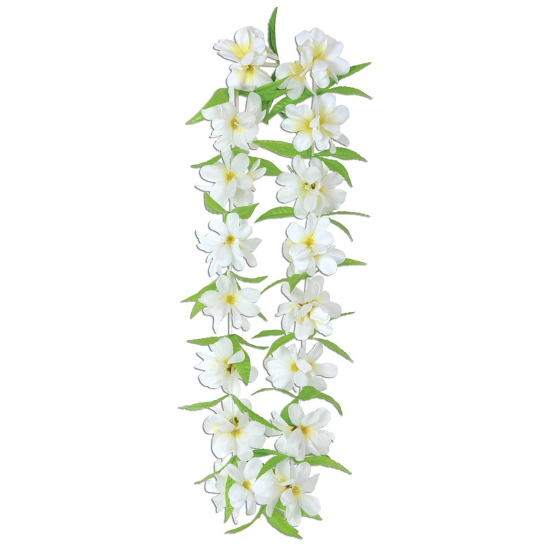 Beistle 57390 Silk 'N Petals Tropical Jasmine Lei. This lei is made of white flowers with yellow centers and green leaves. The lei measures 40 Inch long. This is a very pretty floral lei for everyone to wear!.