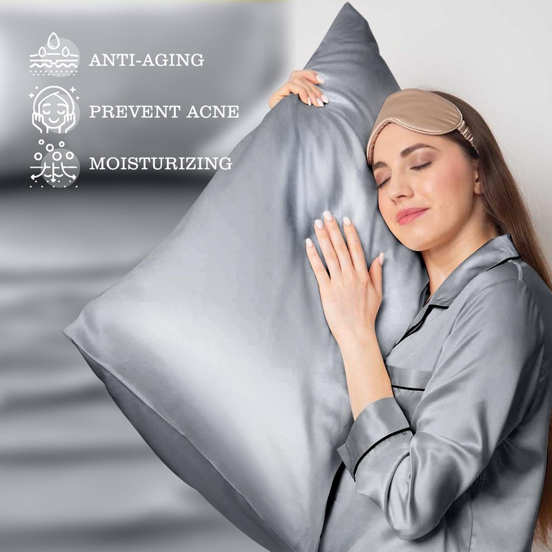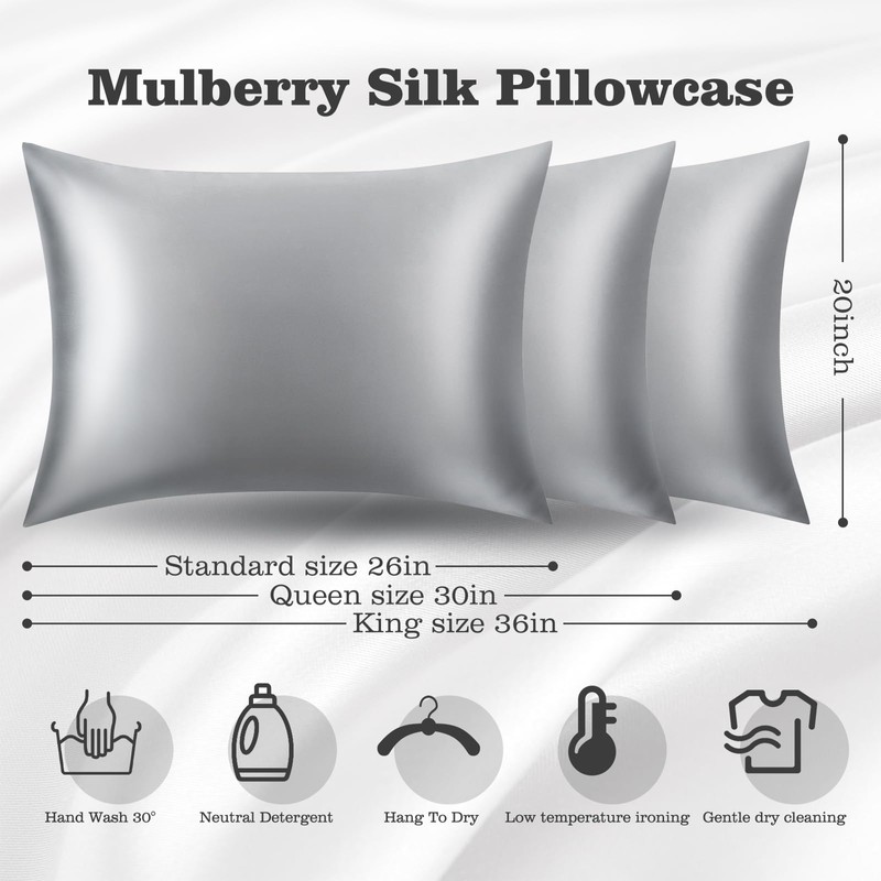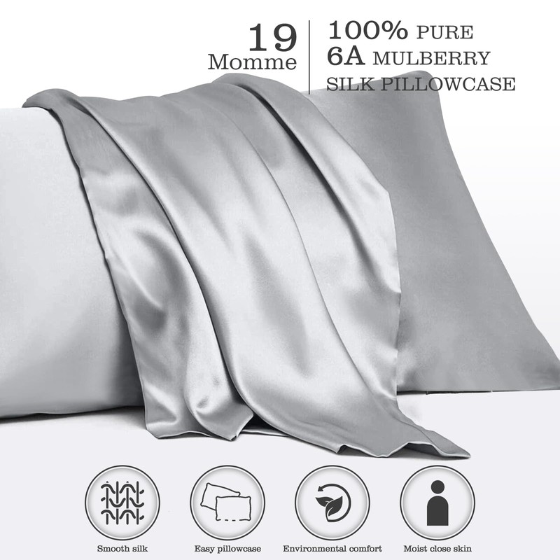 Silk Pillowcase for Hair and Skin, Silk Pillow Cases for Women, Soft Breathable Smooth Mulberry Silk Queen Size Pillowcase Set of 2, Cooling Pillow Cases Silk Pillow Covers with Zipper, Gray