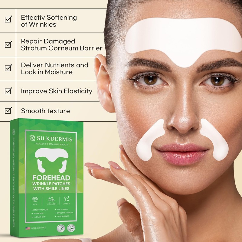 - [SPECIALLY FORMULATED SILKDERMIS PATCH]- Our specially formulated facial patches, which includes collagen, vitamin E, and aloe, effectively reduces the appearance of forehead wrinkles while improving skin structure and firmness for a more youthful and smoother-looking skin.