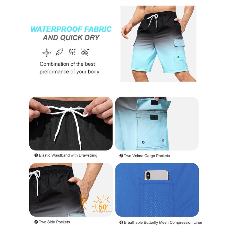 - 5 Pockets Swim Trunks: SILKWORLD cargo pockets bathing suits for men have 2 velcro cargo pockets, 2 side pockets, and 1 compression lined pocket. Multi-pocket design provides additional storage, convenience, comfortable & safety