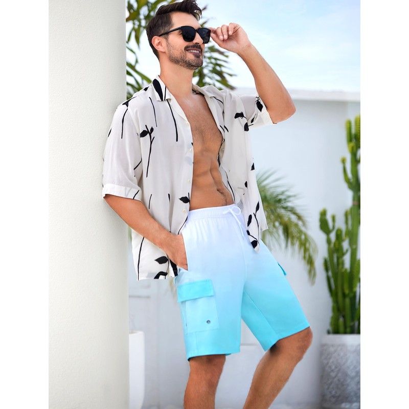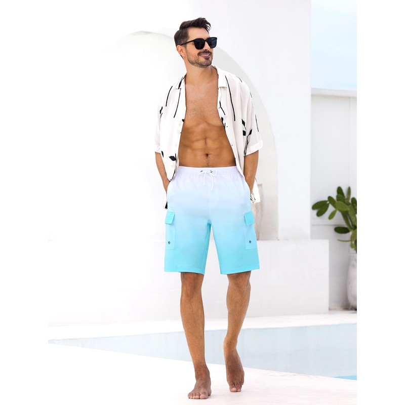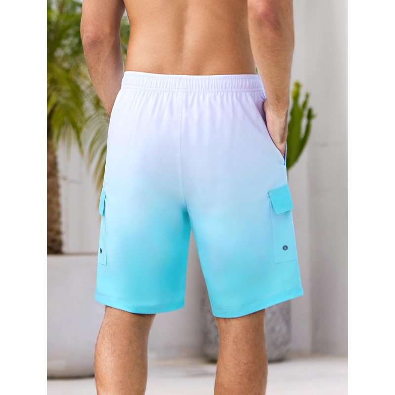 SILKWORLD Mens Swim Trunks 9" Swimming Shorts Quick-Dry Bathing Suits with Compression Liner and Cargo Pockets Gradient White Blue X-Large