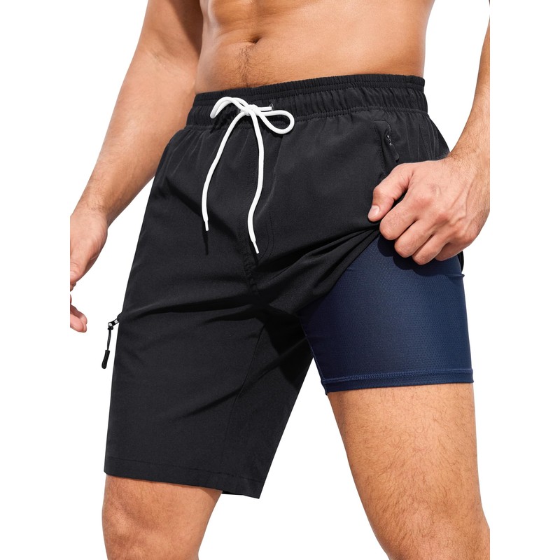 SILKWORLD Mens Swim Trunks with Compression Liner 9 Inch Inseam Quick Dry Bathing Suits Summer Beach Swimming Shorts with Zip Pockets,Black,Small