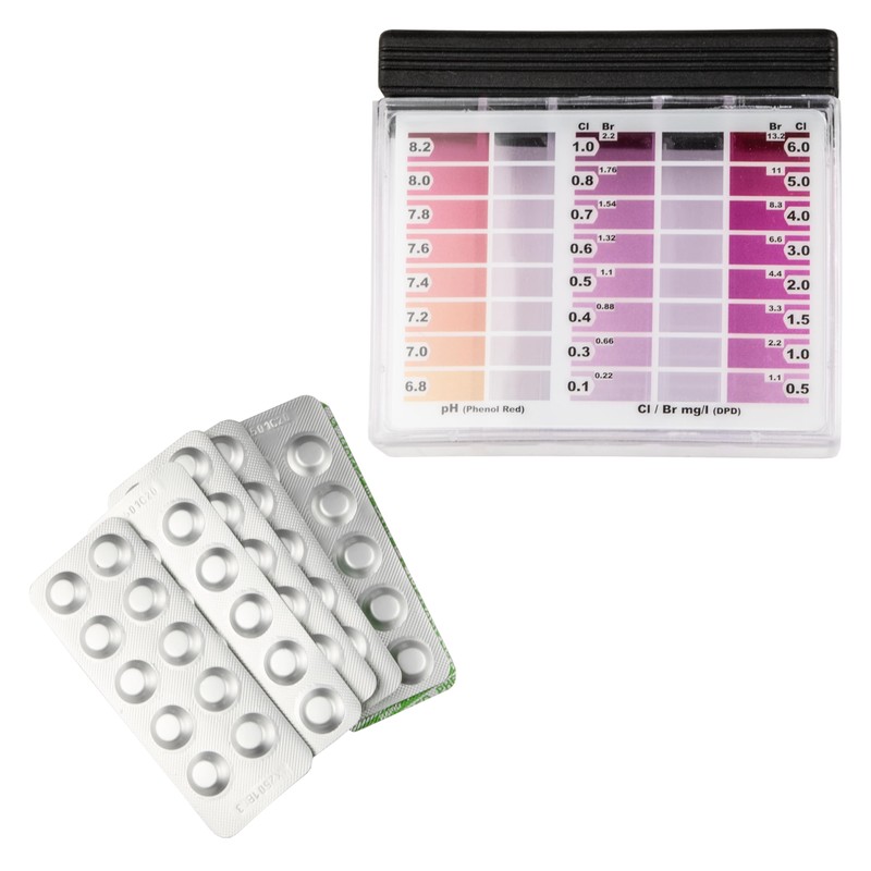 The test takes only a few minutes. Simply fill the test chambers with water, add the appropriate Phenol Red and DPD NO.1 tablets, then compare the colour of the sample with the included scale.