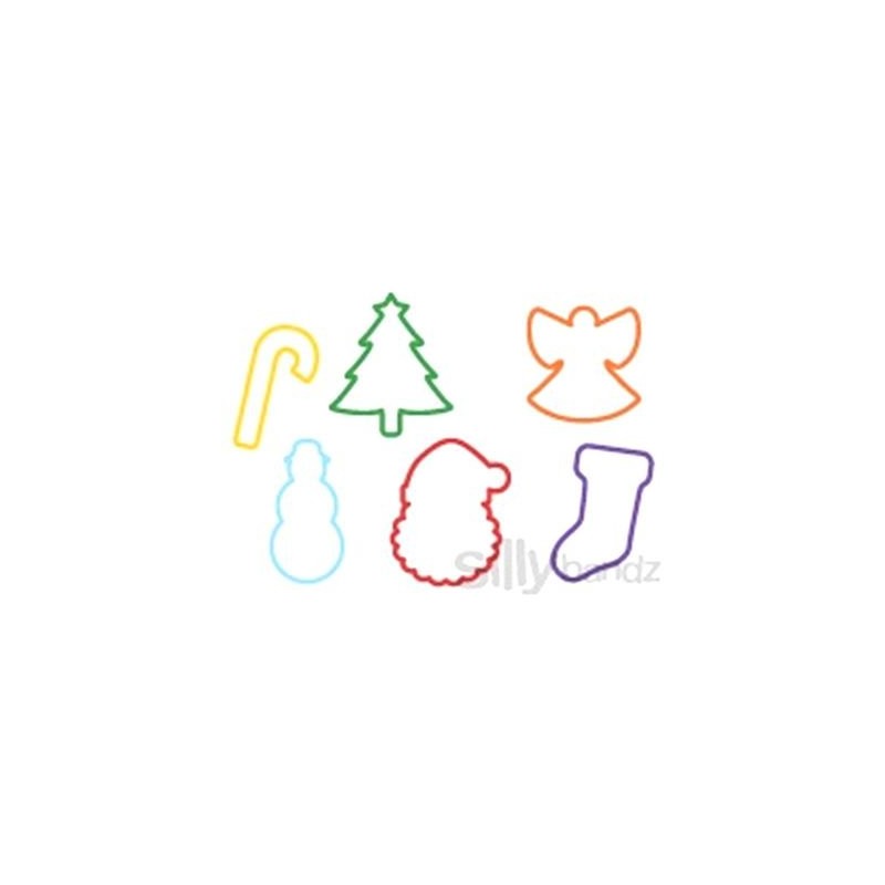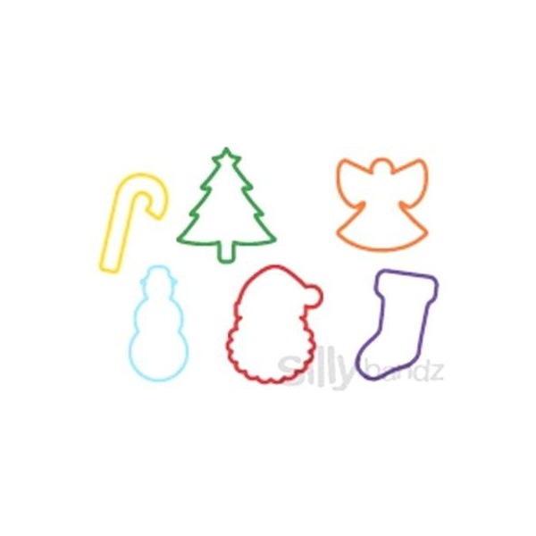 Quantity: 1 pk of 24 bands: Holiday Shaped Silly Bandz - 4 ea - Santa, Snowman, Christmas Tree, Stocking, Candy Cane and Angel. After being stretched they will return to their original animal shape. Bring fun back into your home or office with these clever rubber bands! They look and behave like normal rubber bands when stretched. But when removed from whatever they are holding, they instantly spring back into their original Holiday shapes! The Hottest Thing since the Pet Rock! Worn as Bracelets, Traded & Collected by the Kindergarten & Elementary School set. But you can enjoy them too. Flick them at your co-workers, use them for wrapping presents or horde them all for yourself. What a great gift for students or parties. These are a favorite for magicians and parties.