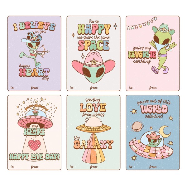• Quirky and Fun: This set of 24 Valentine's Day cards features hilarious groovy, alien designs. With witty, sarcastic phrases perfect for spreading some humor.