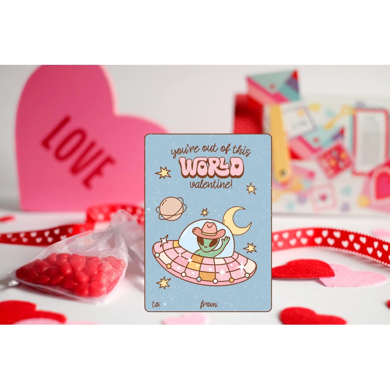 Spread some out of this world cheer this Valentine's Day with these funny and groovy alien -themed classroom sharing cards! This set of 24 cards features quirky designs and punny phrases like "I believe in you", "I'm so happy we share the same space", and "Sending love from across the galaxy" - plus more!. Perfect for people who love a little humor, these cards let them celebrate the holiday in a unique and playful way. The cards are printed on high-quality cardstock and measure approximately 4" x 3" each. Whether you're looking for classroom Valentines or just a fun novelty item, these cards are sure to get a few laughs. Quality USA Made