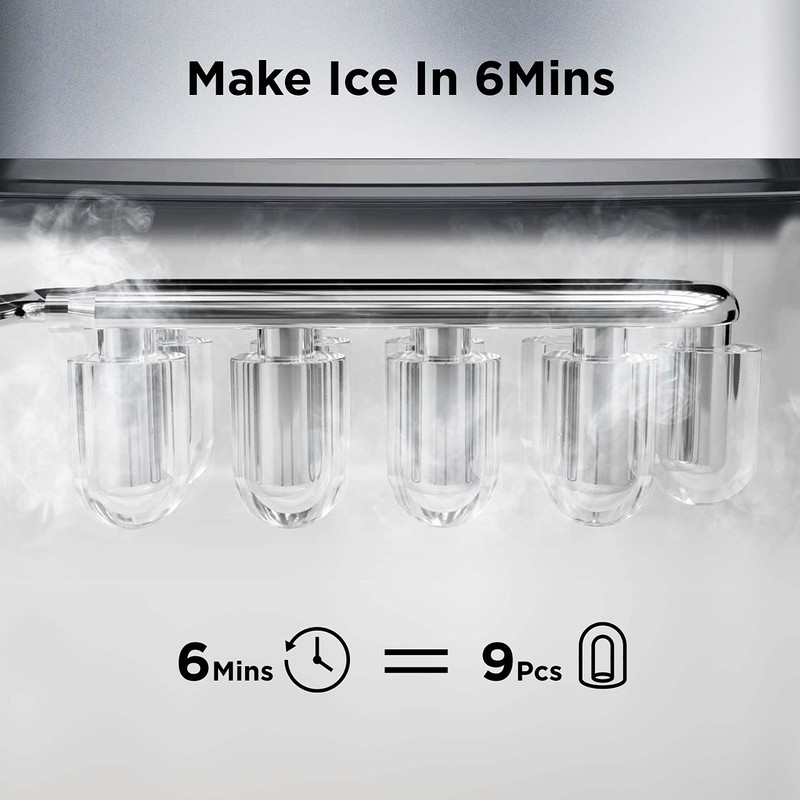 - FAST ICE MAKER: The Silonn ice maker only takes 6 minutes to make 9 bullet-shaped ice cubes. Fill 2L of water into the water tank, maximum ice capacity can reach 26 pounds in 24 hours.