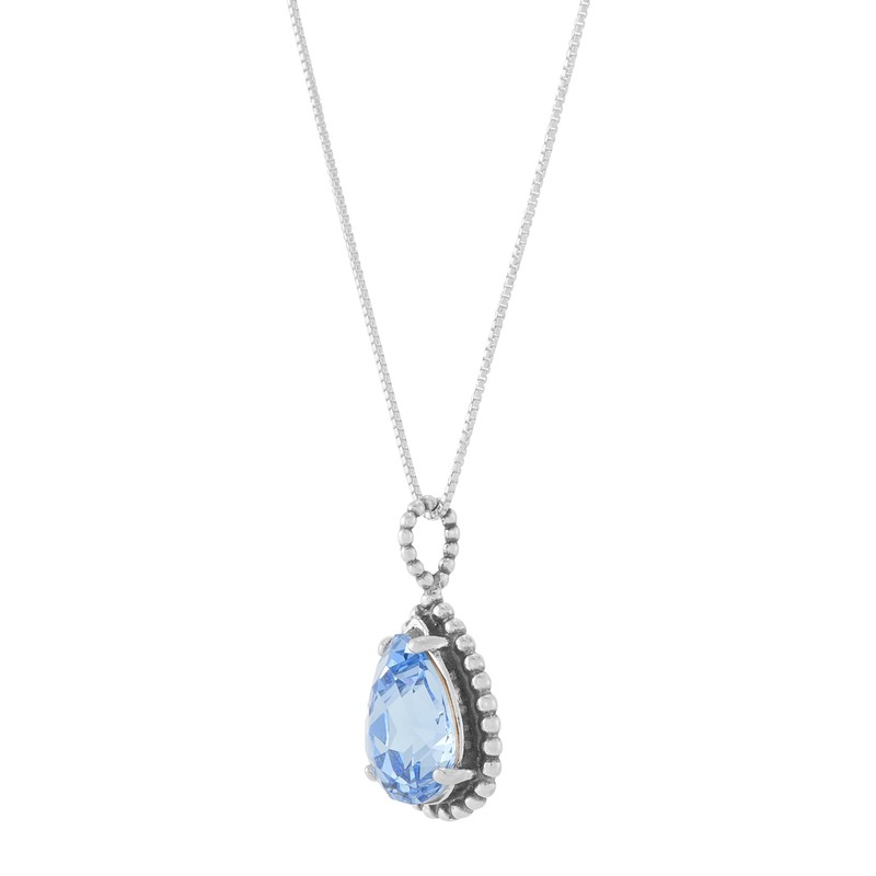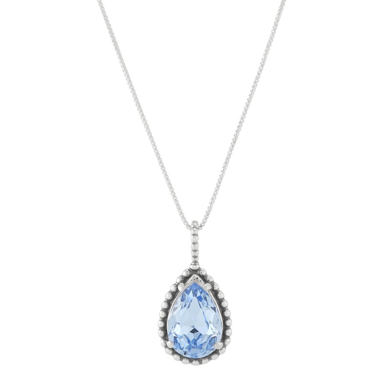 - The brilliant teardrop-shaped 10mm by 14mm blue crystal brings subtle color to this simple design. The beaded frame adds just enough detail to draw the eye. It complements everything from laid-back outfits to sophisticated ensembles. The piece comes with a “.925” sterling silver stamp as a symbol of guaranteed product quality.
