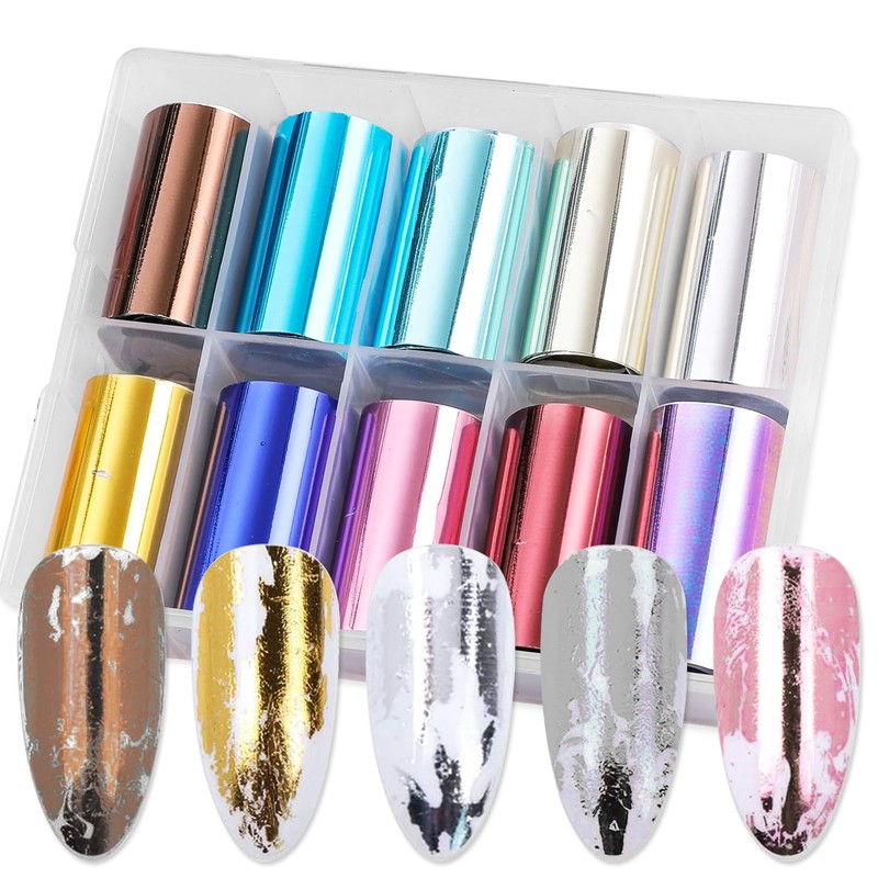 - Package Content - 10 rolls nail foil transfer, with 10 kinds of color design, the size of each roll is 4cm x100cm/1.57inch×39.4inch. larger size is more suitable for gel acrylic nails.