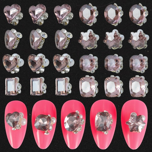 SILPECWEE 24pcs Nail Rhinestones and Charms, Purple Glass Nail Gems Crystal Diamond Pearls Alloy Nail Jewelry Studs Flat-Back Nail Art Decoration for Nails Supplies