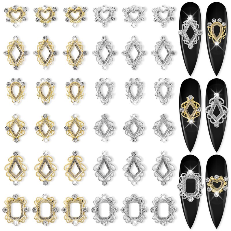 SILPECWEE 36pcs Metallic Frame Nail Charms 3D Gold Silver Charms for Nails Flat Back Nail Rhinestones Crystal Hollow Irregular Frame Nail Studs Nail Jewels Decoration for Acrylic Nails