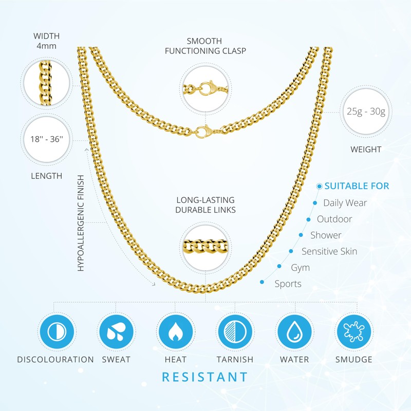 Silvadore 4mm Mens Gold Chain Necklace - Real 18k Plated Stainless Steel CUBAN Link Jewellery - NON-TARNISH & Waterproof - 51cm / 20 inch (Velvet Pouch)