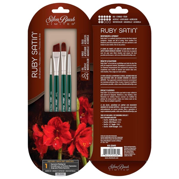 Silver Brush Limited RSS-2540S Ruby Satin Expressive Painting Set, Set of 4 Brushes, Round Size 2/0, Triangle Size SXM, Filbert Size 10, and Angular 1/2 Inch