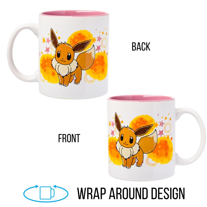• POKÉMON EEVEE: Adorned with a charming toss print featuring images from the Pokémon universe, including Eevee surrounded by star splatters, adding a touch of whimsy to your morning routine