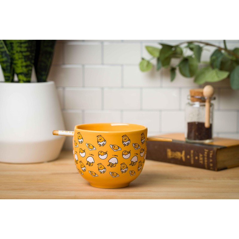 - tazón de ramen: mejora tu juego de ramen con este impresionante tazón de cerámica con patrón amarillo Gudetama con palillos. Este tazón ramen cuenta con Gudetama en varias posiciones divertidas contra un fondo amarillo