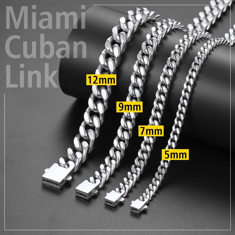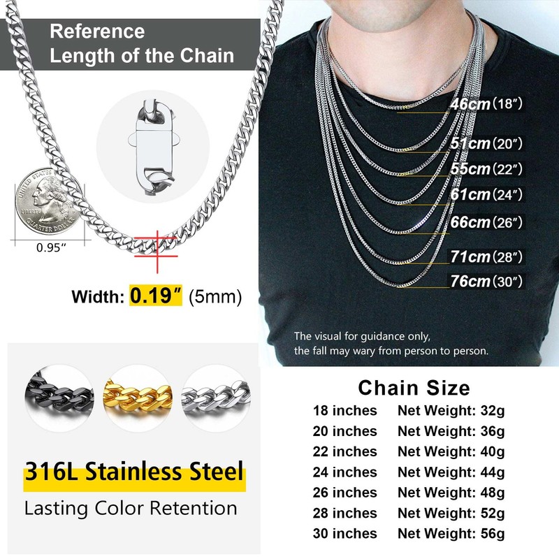 - Various Chain Length: 18''/20''/22''/24''/26''/28''/30''inches(46/51/55/61/66/71/76cm),just adjust to match your need,suits for adult men/women or young boys too.Width:5/7/9/12mm.Chic piece matches well with all your formal and causal attires for everyday modern elegance
