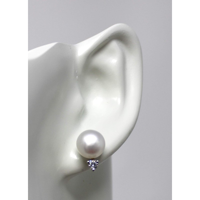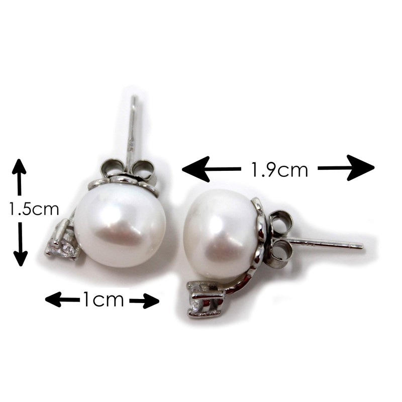 Silver Cubic Zirconia 9.5-10mm White Freshwater Cultured Button Shape Pearl Stud Earring Pair