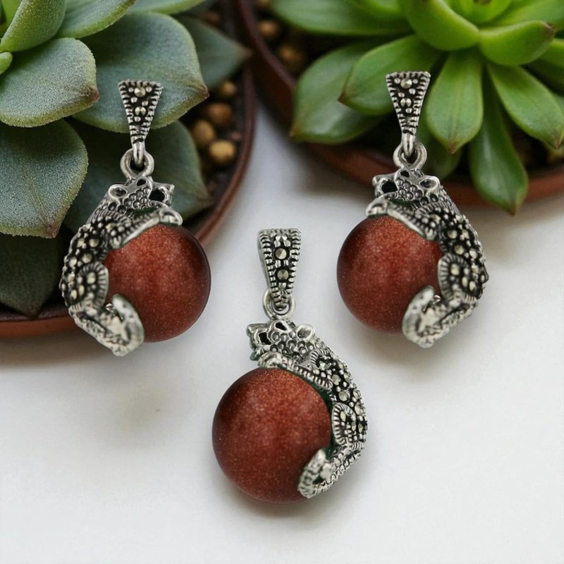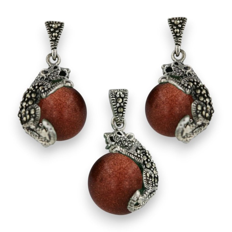 - ELEGANT DESIGN: 925 Sterling Silver Cougar with Marcasite Hold the (12mm) Glittering Red Gold Sand Stone Ball Earring and Pendent High Polished Ball Shaped Gold Sand Stone. Size of the Earring and Pendent both 26X16mm also Comes with 18" Sterling Silver ROLO Chain Make a fashion statement with this eye-catching, vibrant piece. Perfect for every occasion!