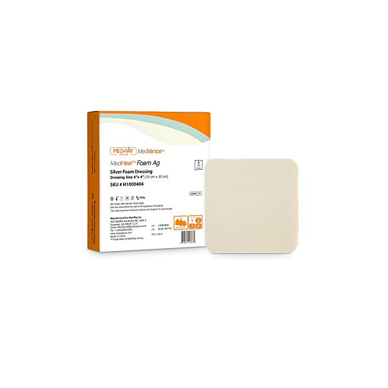 Silver Foam Ag Sterile Highly Absorbent Antibacterial Dressing w/o PU Backing, 4"x 4", 5 dressings/Box, MedHeal by MedvanceTM