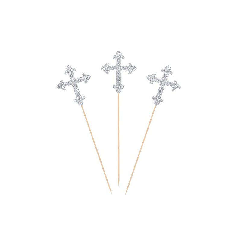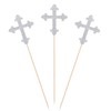 Silver Glitter Cross Centerpiece Sticks for Baptism Christening Party Decorations - Set of 10