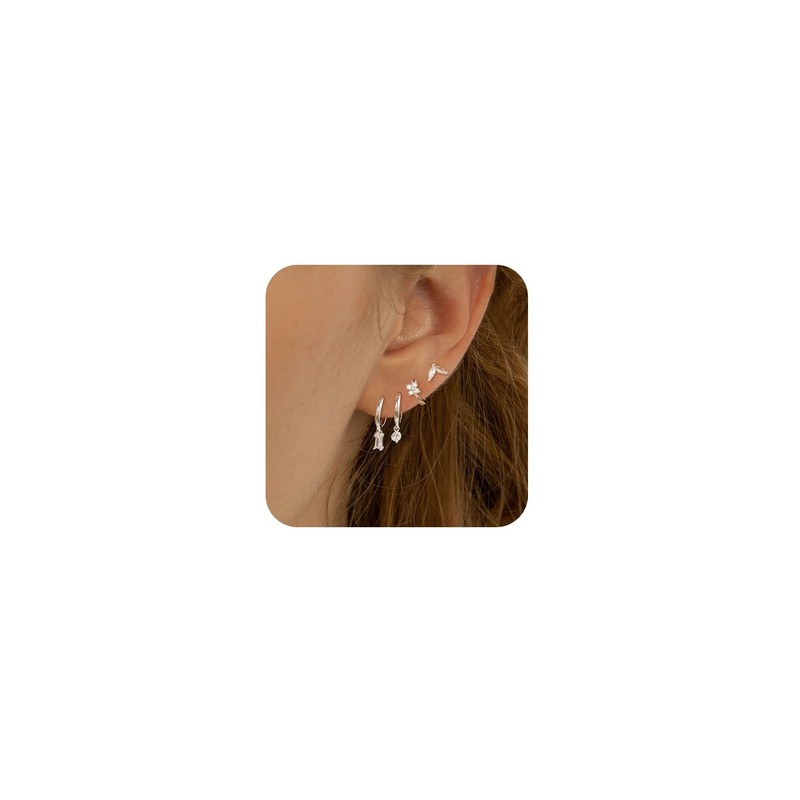 - HOOP EARRING SET SIZE:The silver earrings set is the perfect combination of earrings and studs, including flower CZ hoop earring with a diameter of 12mm, round CZ hoop earring with a diameter of 14mm, square CZ hoop earring with a diameter of 14mm, and CZ leaf earring studs with a length of 14mm. Our silver huggie hoop earrings are packaged in a beautiful gift box, making them a great gift choice