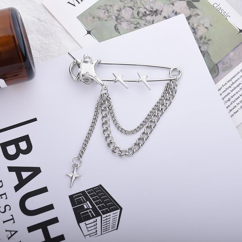 - Decorative Retro Punk Pins Silver: The y2k star pin with chain has a unique design, consists of one cross star chain pendants and a brooch decorated with three cross stars, by pinning this chain pin to your outfit can catch people's eyes and show your unique taste in fashion, safety pin boooch tassel for women clothes