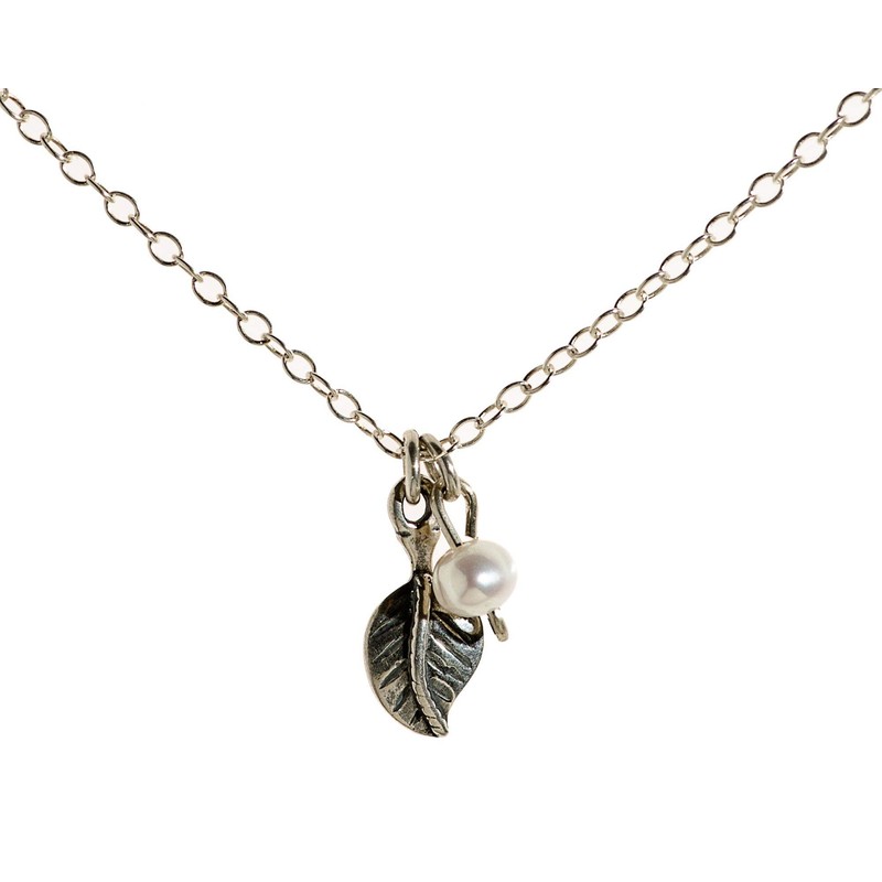 - sterling silver necklace with tiny sterling silver leaf pendant and fresh pearl. So simple and delicate- love it! Perfect holiday gift for you. Necklace measures approximately 17" Made from sterling silver .