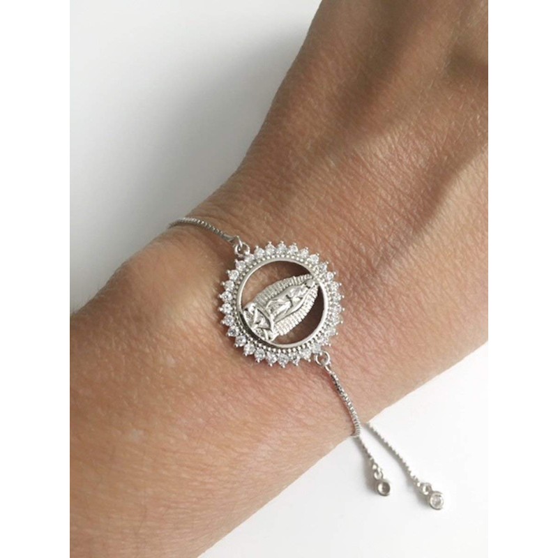 - Details: is made with an adjustable chain brass silver plated with a cubic zirconia round connector and Our Lady of Guadalupe silver plated silhouette in the center with a zip fastening which makes it easy to put on and off by yourself. The measure of the Virgin connector is 1 inch or 2.5 cm.