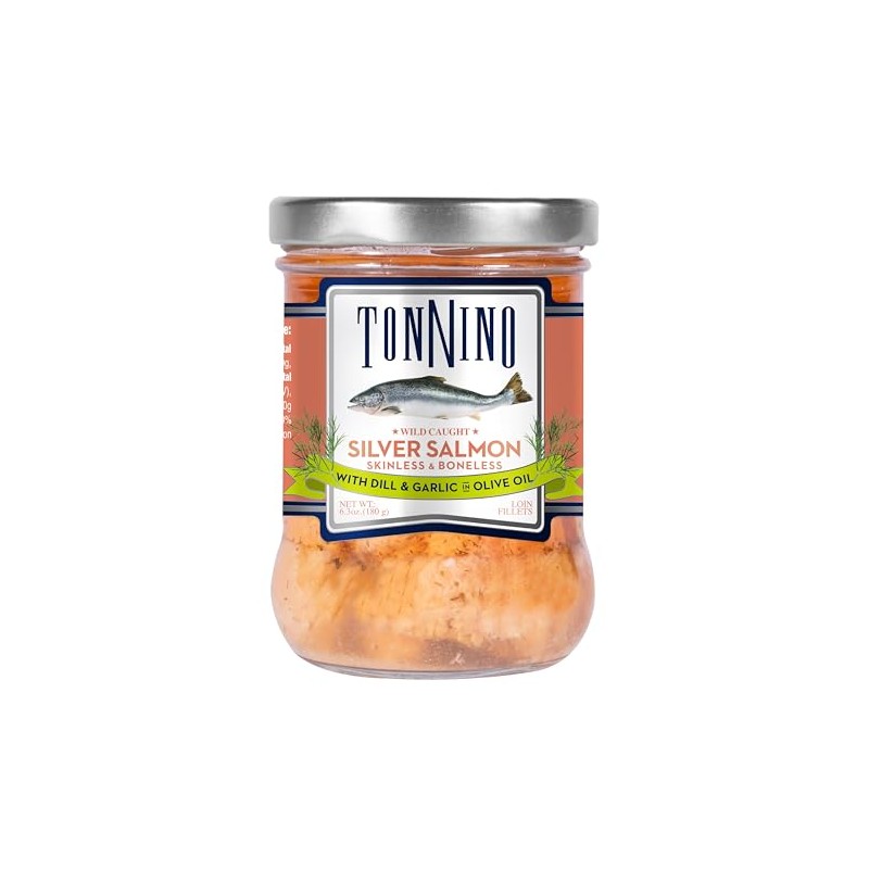 Tonnino Silver Salmon Fillets in Extra Virgin Olive Oil Discover the exquisite taste of Tonnino Silver Salmon Fillets, perfectly preserved in premium extra virgin olive oil. Our smoked salmon is a fresh, flavorful alternative to traditional tuna in olive oil. Each 6-pack contains 180g of high-quality, wild-caught salmon fillets that are rich in nutrients and bursting with flavor. Why Choose Tonnino Silver Salmon Fillets? Premium Quality: Our salmon fillets are sourced from wild-caught salmon, ensuring you receive the freshest and most natural taste. Rich in Nutrients: Packed with omega-3 fatty acids, protein, and essential vitamins, our salmon is a healthy choice for any meal. Versatile: Perfect for salads, sandwiches, or as a standalone gourmet treat. Enjoy the rich, smoky flavor and delicate texture. Sustainably Sourced: We prioritize sustainability and environmental responsibility in our fishing practices. Perfect for Every Occasion Whether you're hosting a dinner party or looking for a nutritious snack, Tonnino Silver Salmon Fillets are a versatile addition to your pantry. The rich, smoky flavor of our smoked salmon makes it an ideal choice for appetizers, main courses, or even a luxurious breakfast option. Ingredients: Silver salmon, extra virgin olive oil, natural smoke flavor, sea salt. Nutritional Information (per 180g serving): Calories: 250 Total Fat: 15g Protein: 20g Omega-3: 1.5g