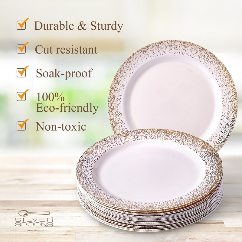 - DELUXE QUALITY: These beautiful plastic dessert plates are composed of high-rated heavyweight plastic materials rendering the plates leak-free, soak resistant, cut proof and unbreakable. These plates are 100% food grade and safe to use for a fine dining experience