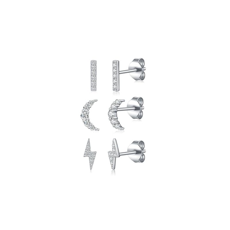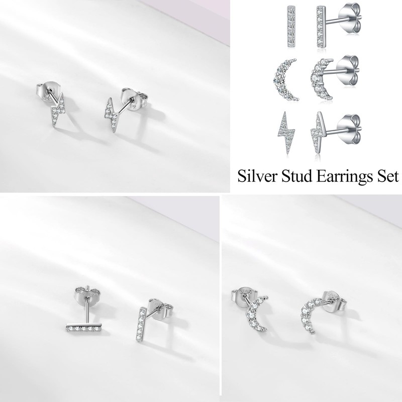 - 【Small Stud Earrings Set】 Our silver stud earrings set is consist of 3 pairs of earrings, including 1 pairs of 7mm moon stud earrings & 1 pairs of 7mm bar stud earrings & 1 pairs of 7mm lighting stud earrings. Perfect for stacking together with other earrings or wearing alone.