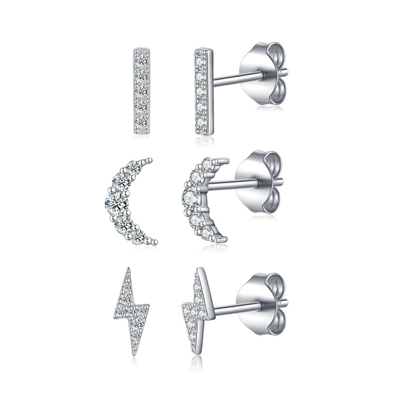 Silver Stud Earrings for Women, 3 Pairs Silver Small Stud Earrings, Moon Bar Lighting Studs Earrings Set, Cubic Zirconia Silver Studs Jewelry Gift for Girls Teens