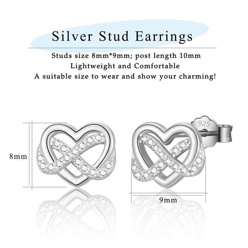 - 【Infinity Heart Stud Earrings】Our silver studs earrings are designed in the shape of a heart with cubic zirconia infinity symbol, sweet and romantic, super sparkling and beautiful. Great choice for daily wear.